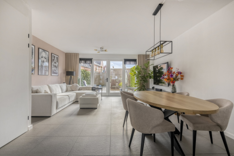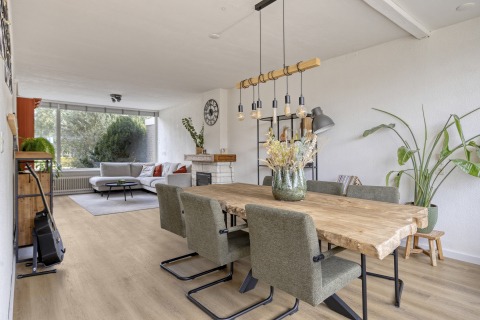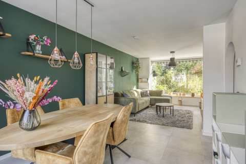 Dankzij de royale indeling is er ruimte genoeg voor een grote eettafel waar het hele gezin samen kan ontbijten, knutselen of uitgebreid tafelen met familie en vrienden. Via de loopdeur of de dubbele openslaande deuren sta je direct in de zonnige tuin — ideaal voor kinderen die naar buiten rennen of voor lange zomeravonden met vrienden aan tafel.