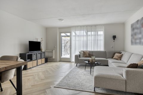 De woonkamer aan de voorzijde is minstens zo fijn. Door de brede erker valt er heerlijk veel daglicht binnen en voelt de ruimte nog groter aan dan hij al is. Met zijn 26 m² kun je hier alle kanten op: een grote hoekbank, een tv-meubel én nog genoeg ruimte voor een speelhoek of leesstoel. De sfeer is warm en gezellig, en dankzij de strakke afwerking hoef je hier niets meer te doen. Onder de trap is een vaste kast weggewerkt, ideaal voor speelgoed, gezelschapsspellen of de stofzuiger — alles binnen handbereik, maar uit het zicht.